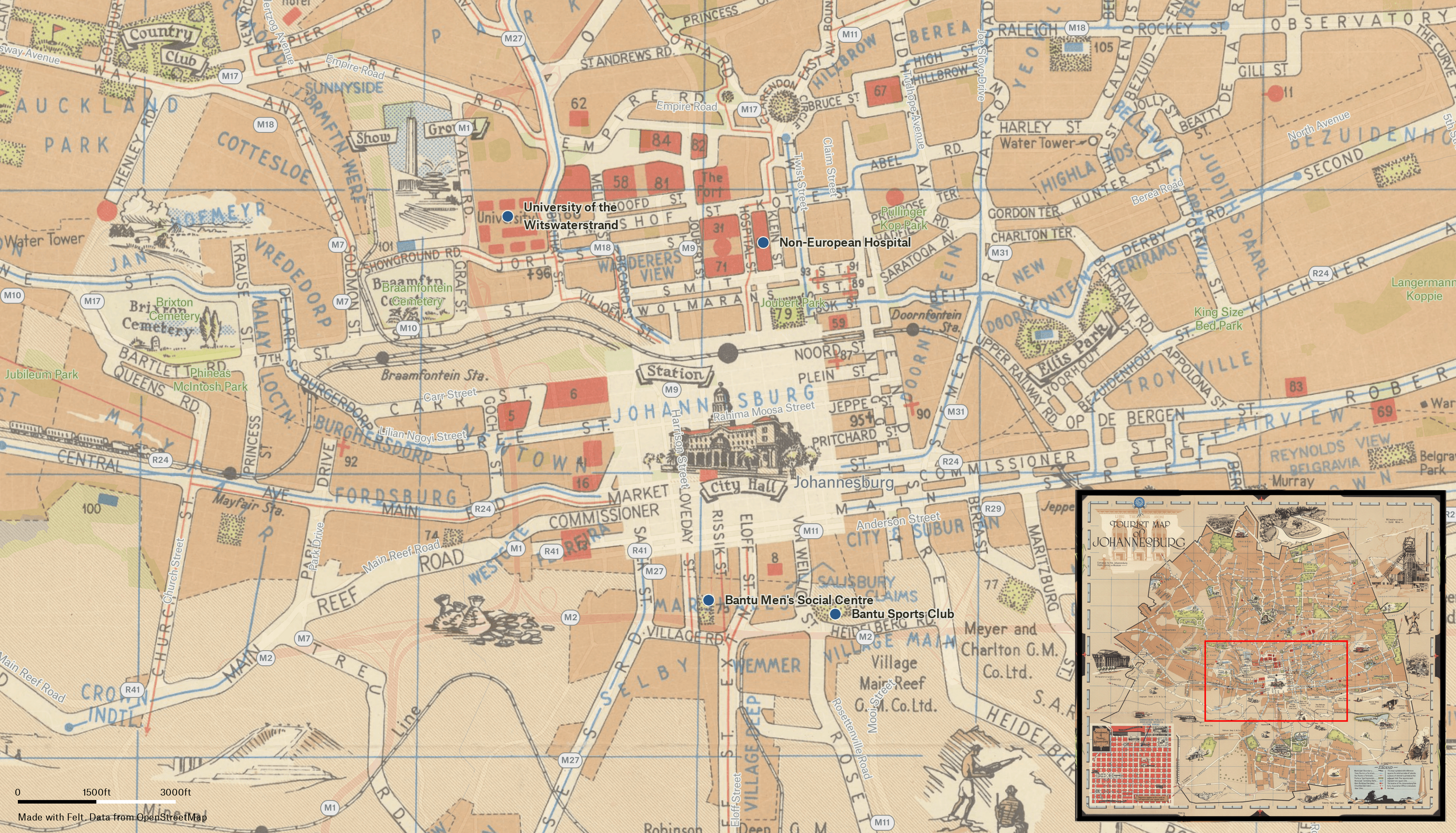 Once we had drafted the preliminary text of the exhibit, I began to fine-tune our content and implement visual features into the Spotlight (at this point, Delaney had transferred projects). I culled through the photographs in Regina’s archive, searching for photos of the institutions that the site details. Additionally, I geographically centered the site by mapping these institutions onto a 1951 tourist map of Johannesburg, so that viewers could gain a sense of the extremely close proximity within which these institutions existed.