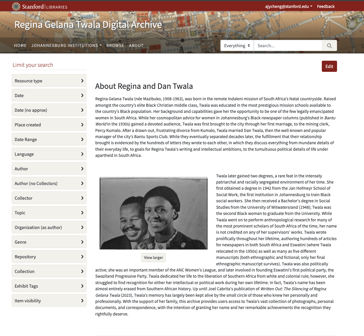 After we submitted all of the metadata for accessioning at Stanford Libraries, the next step lay in creating the Spotlight exhibit itself. We began with the text, word-searching through all of Regina’s letters for references to specific Black Johannesburg institutions of her time - the Bantu Men’s Social Center, the Bantu Sports Club, Jan Hofmeyr School for Social Work, among others. We made note of every relevant letters’ source ID according to the subject, so that I could organize these primary sources for archival view in the Spotlight. We then crafted relevant explanatory paragraphs for the exhibit portion of the site, drawing from Regina’ archive and outside secondary sources to paint a fuller picture of these seminal institutions.